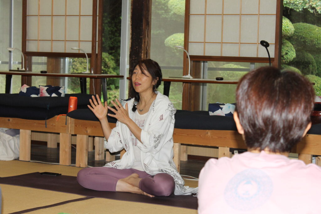 皆で「オームー」と静かにマントラを唱えます。マントラが共鳴して大きくなり、空間が整うということを体感しました。3回行った後、ロータスと呼ばれる蓮の花のポーズ、決意表明と続けて、呼吸法でわだかまりを手放します。テレビを見ながらでも出来る準備運動を行った後、10個のポーズを教わり、繋げて3回行いました。