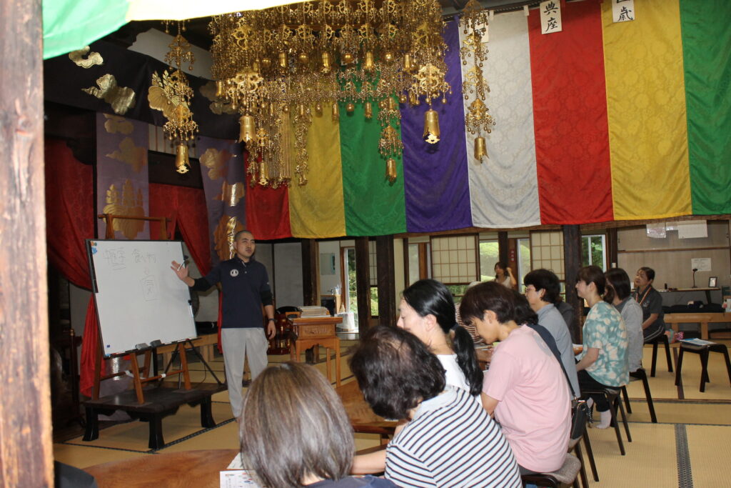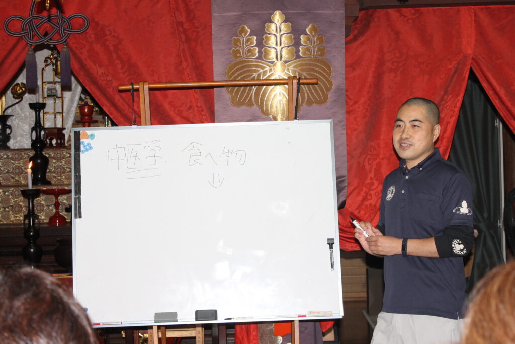 昨年に引き続き開催された寺ヨガ講座。今年度は「寺ヨガ×お寺で講話」と題して、仙台なな氏がこれからの季節に備えた心身の調和を整えるヨガを指導、佐藤善廣氏が昨年の薬膳のキホンの「き」のお話を深め、中医学のモノサシを使って自身を見ることをテーマに講話をしました。