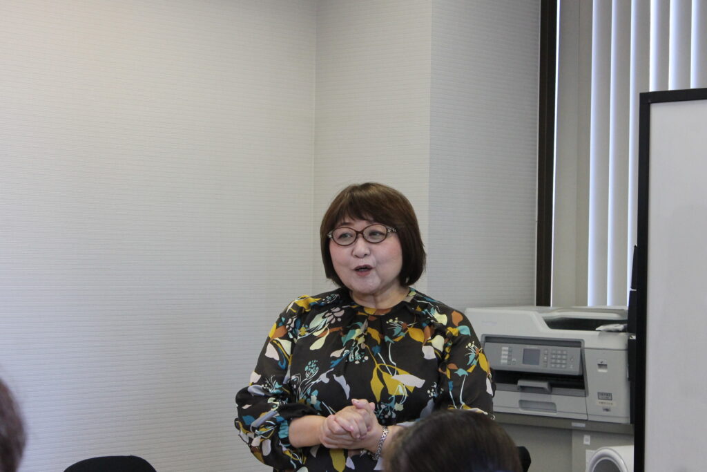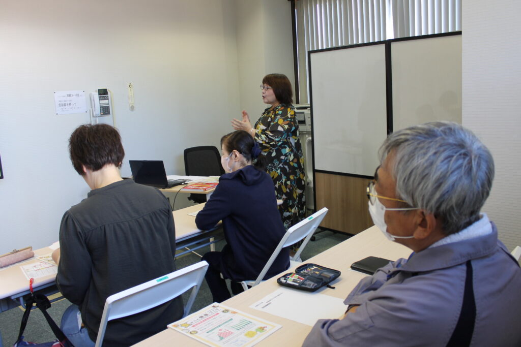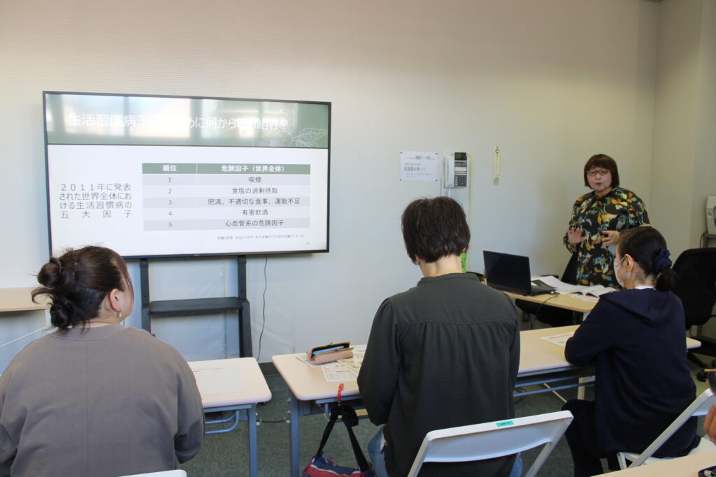 今回の講座は今年度初めてのお仕事講座で、「管理栄養士から仕事と健康を学ぶ」と題し、大館市特別養護老人ホーム つくし苑勤務の管理栄養士 明石淑子さんをお招きし、実際の仕事内容、健康管理についてお話していただきました。